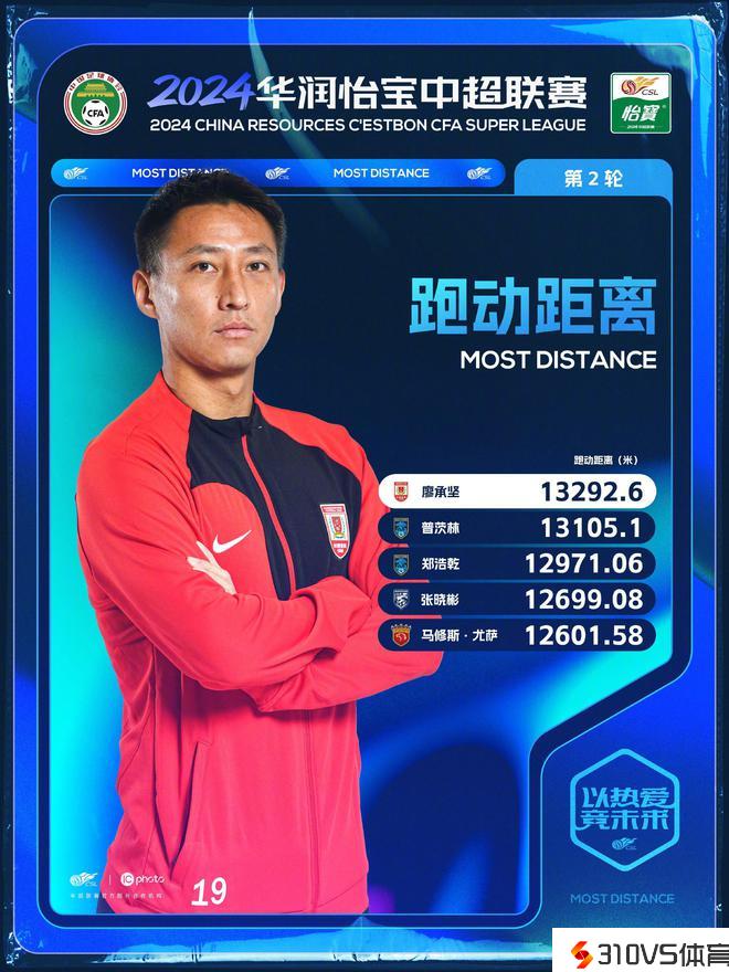 相比拟首轮3人打破13公里大关,本轮有2人跑动距离超越13公里。其中,来自长春亚泰的球员廖承坚,以13292.6米领跑榜单。这个距离比首轮霸榜的周定洋(13327米),仅少了34.4米。