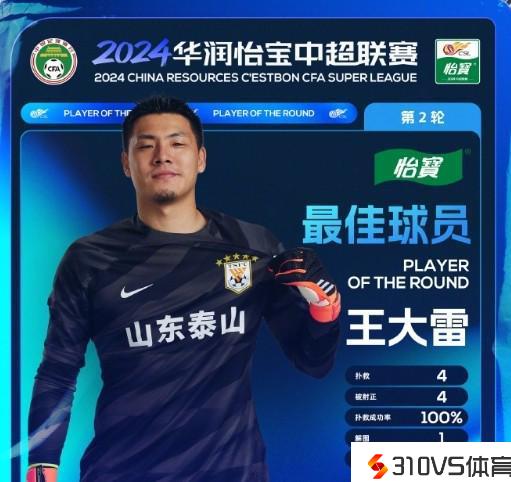扑救成功率100%,泰山门将王大雷中选中超官方第2轮最佳球员