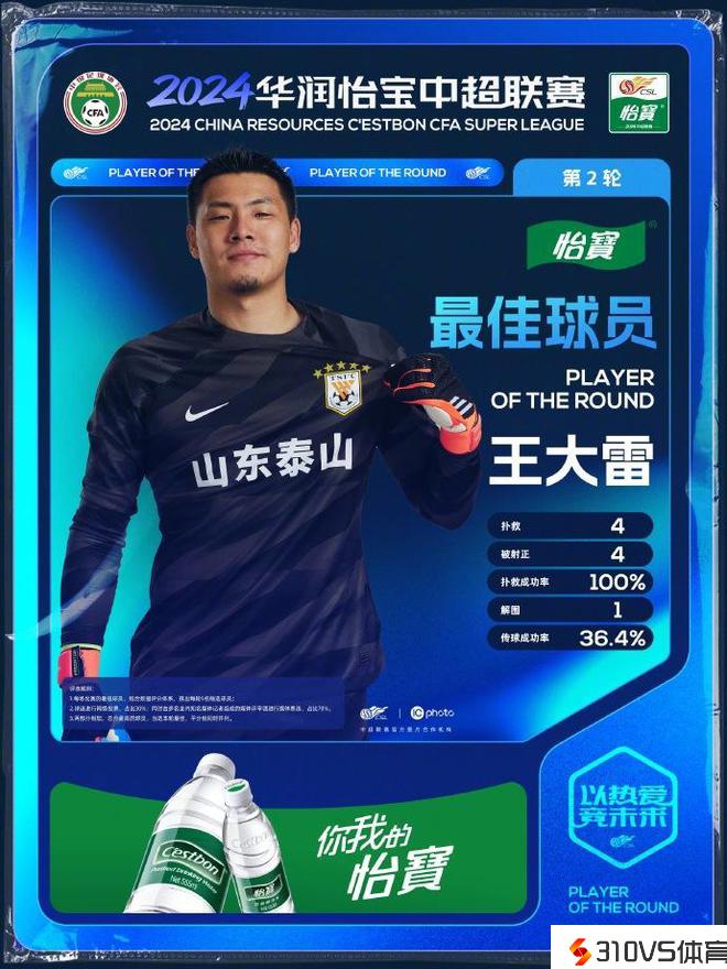 4次扑救力保球门不失!泰山队门将王大雷中选中超第二轮最佳球员