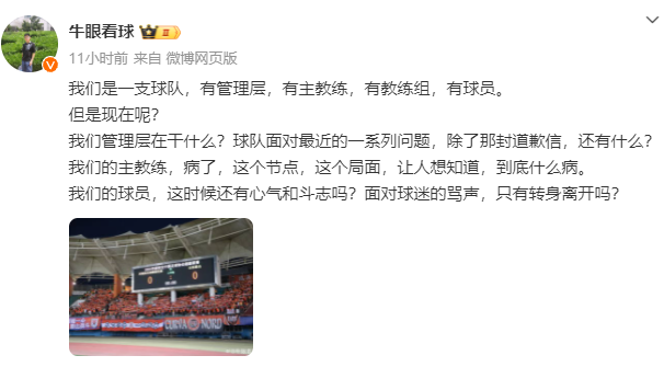 媒体人写道,“我们是一支球队,有管理层,有主教练,有教练组,有球员。但是现在呢?我们管理层在干什么?球队面对最近的一系列问题,除了那封道歉信,还有什么?”