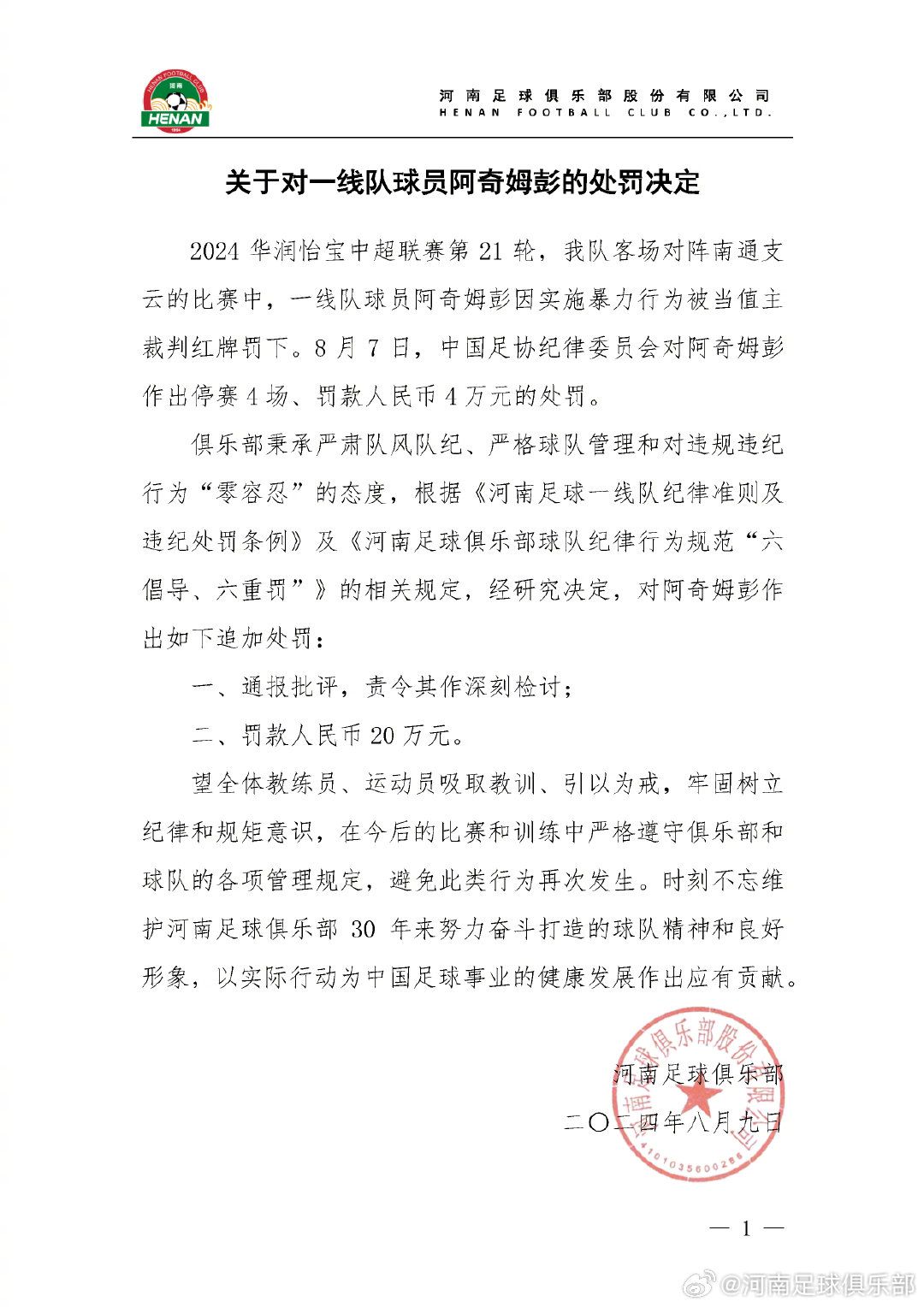 8月9日,中超河南足球俱乐部官方通报,对此前因暴力行为遭到停赛的阿奇姆彭处以通报批评,外加罚款20万元的重磅处罚。