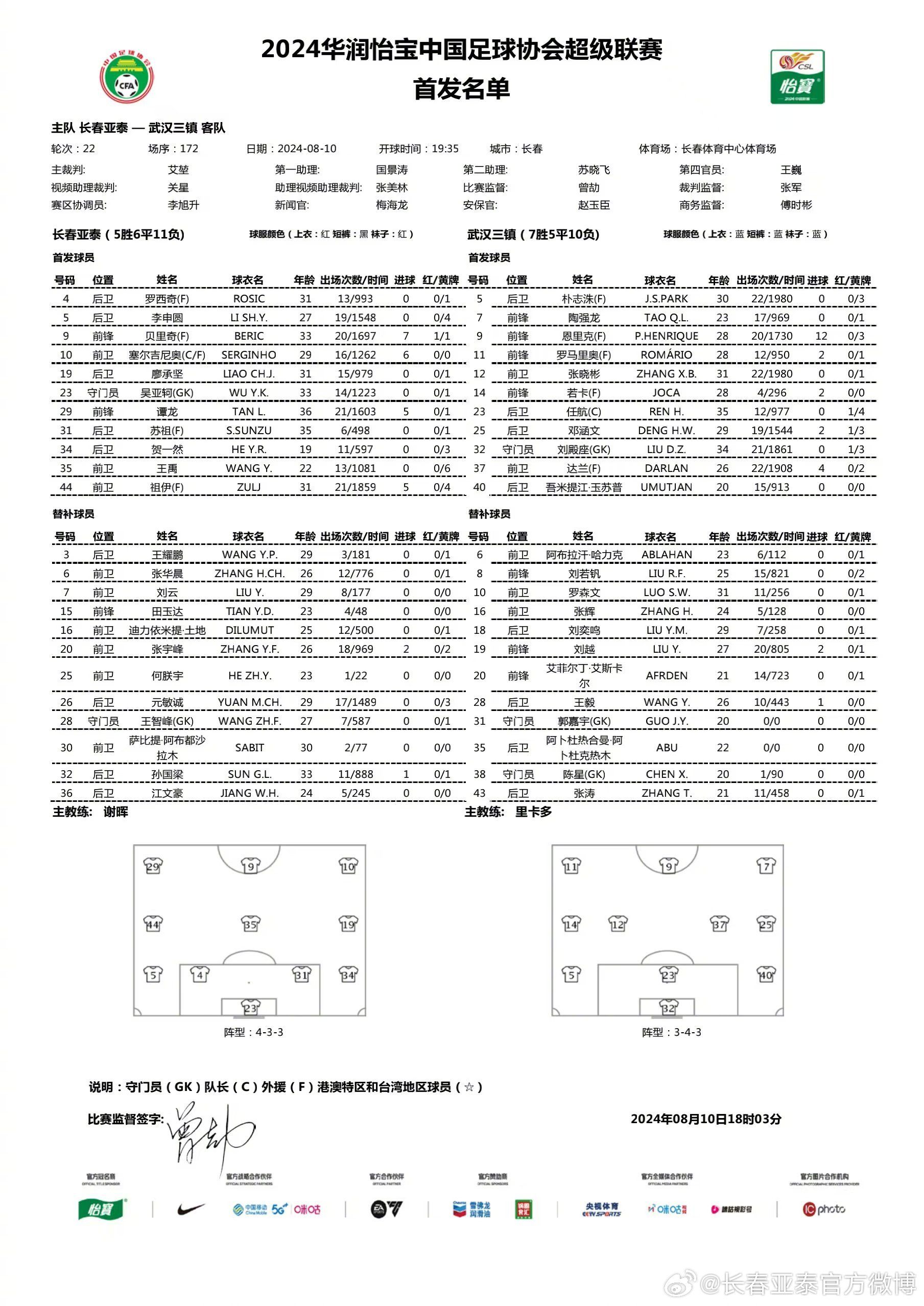北京时间8月10日,中超第22轮,长春亚泰对阵武汉三镇。赛前两队首发名单正式公布: