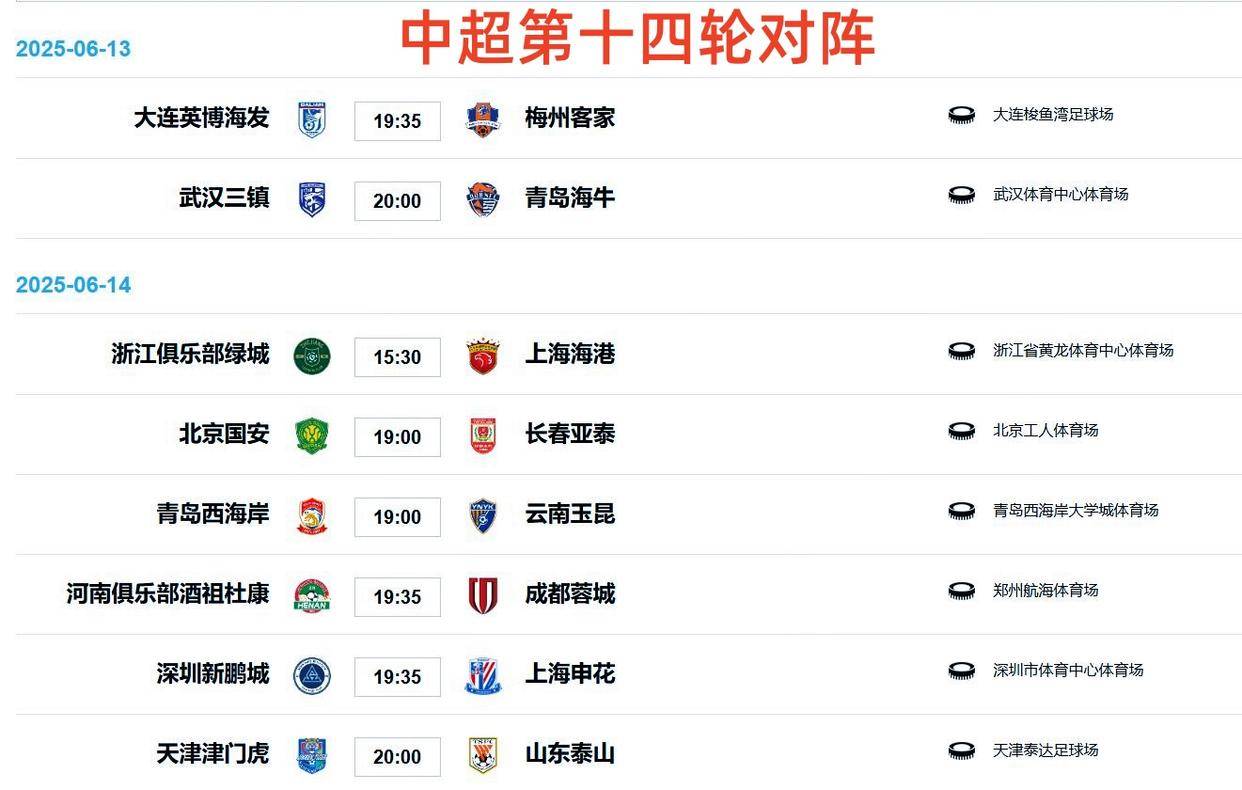 中超联赛战火重燃,第十四轮全面开战,按照赛程本轮对阵形势如下大连英博VS梅州客家、武汉三镇VS梅州客家、浙江VS上海海港、青岛西海岸VS云南玉昆、北京国安VS长春亚泰、深圳新鹏城VS上海申花、河南VS成都蓉城、天津津门虎VS山东泰山。