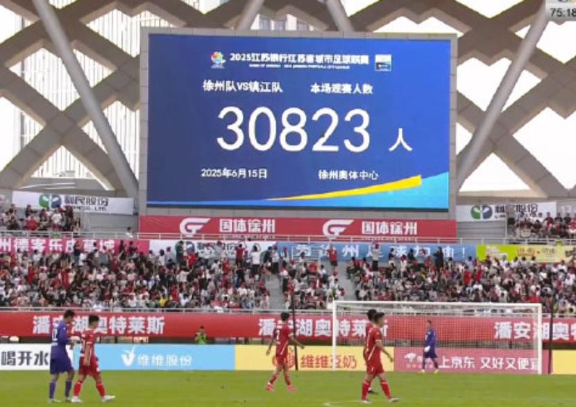 北京时间6月15日,“苏超”常规赛第4轮,徐州队主场1-0绝杀镇江队。根据现场播报,本场比赛现场观众人数为30823人;仅隔一日“苏超”上座纪录再次被打破。