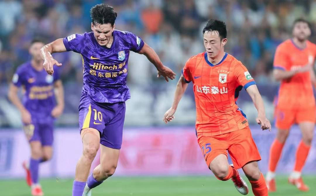 比赛一开始,双方竞争激烈,状态良好,场面十分拼抢并保持着快速节奏。然而,两队均错失多次得分良机。在即将结束上半场时,津门虎打出精彩配合,基莱斯冷静突破黄政宇后攻门得手,让泰山队暂时0-1落后。