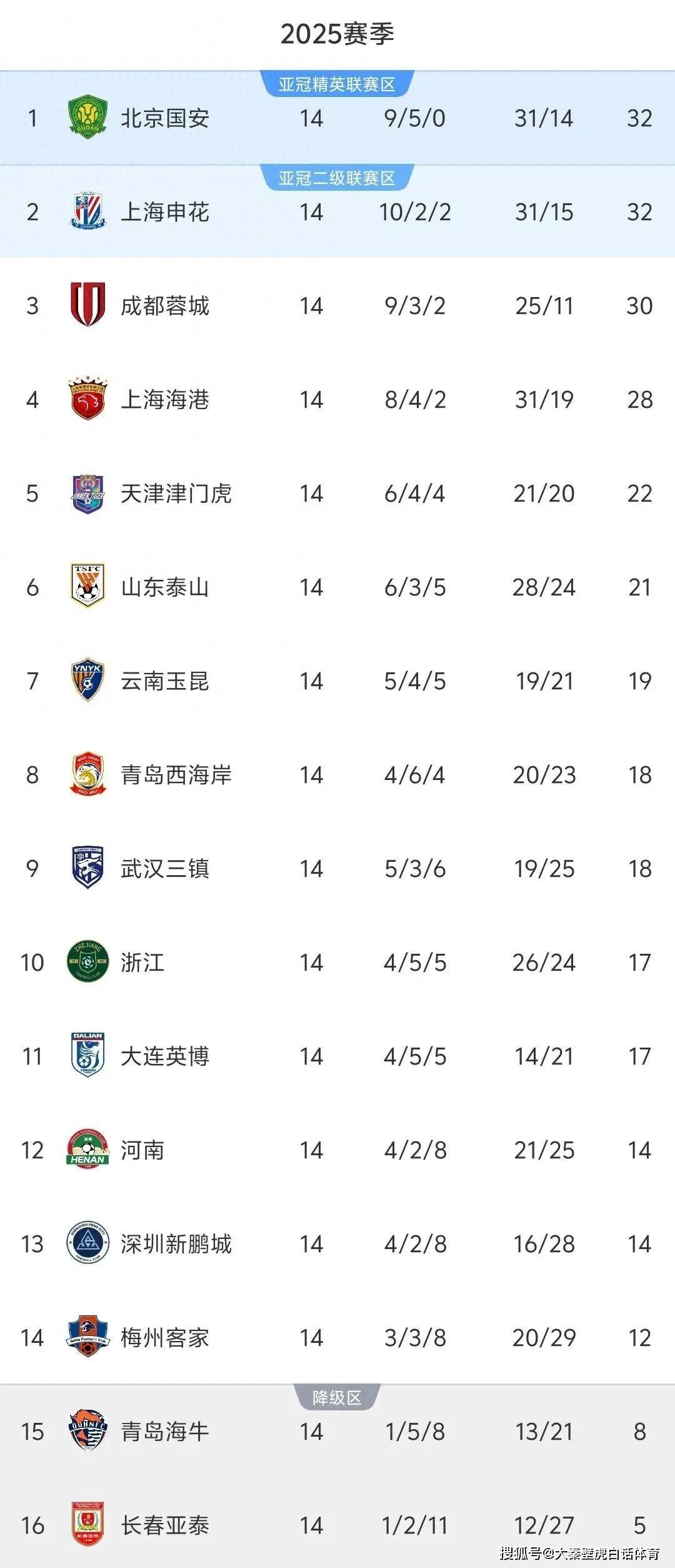 新赛季的中超激战正酣,截至目前结束14轮争夺,传统豪门北京国安队第14轮战胜青岛西海岸队,从而以9胜5平积32分的不败战绩,力压上海双雄,登顶中超最新积分榜。