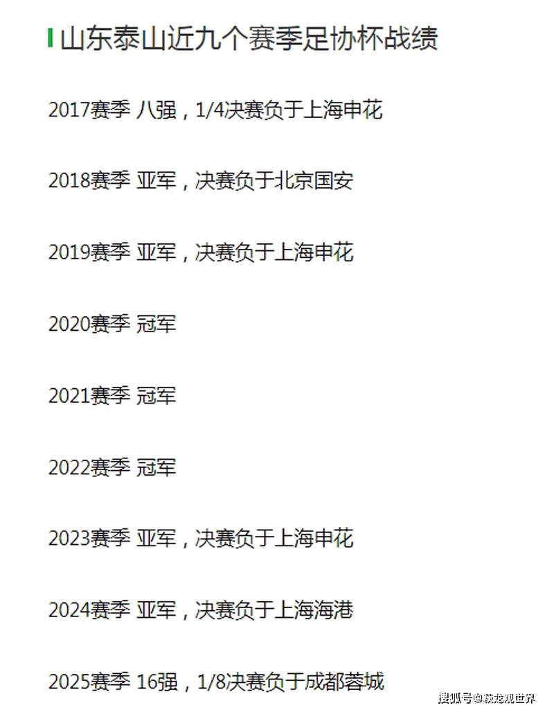 泰山队被淘汰了,你敢相信吗?且是主场作战,球门被对手三度洞穿!2025足协杯1/8决赛,山东泰山1-3不敌成都蓉城,惨遭淘汰。此前,山东泰山在杯赛连续七个赛季打进足协杯决赛,足协杯一度被外界称为“泰山杯”。上次未能进入足协杯决赛还是在2017赛季,如今,倒在了1/8决赛。