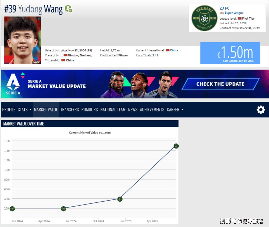 最后,王钰栋的身价已经飙升到本土球员第一,也是目前唯一一位身价过百的球员,如果加上归化球员的话,则是仅次于塞尔吉尼奥的170万欧。