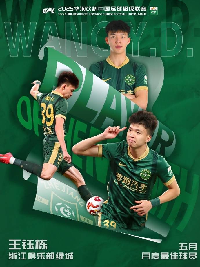 北京时间6月21日消息,今天中超联赛官方宣布,浙江队前锋王钰栋当选中超联赛5月最佳球员。