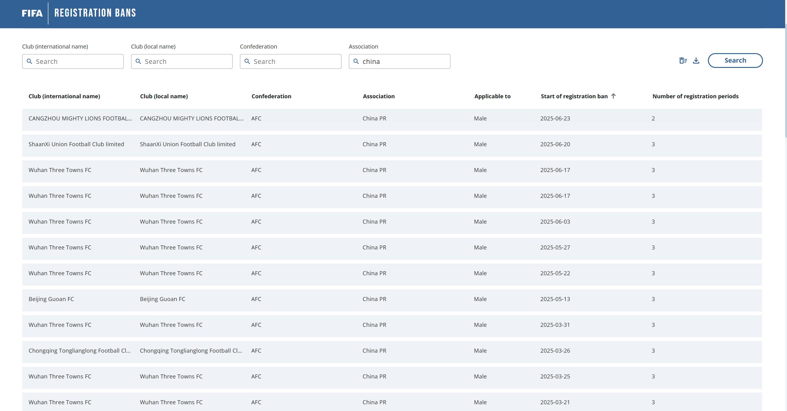 目前,国际足联转会注册禁令公示系统显示,沧州雄狮(已解散)、陕西联合、武汉三镇、北京国安、重庆铜梁龙等球队仍然有转会注册禁令。