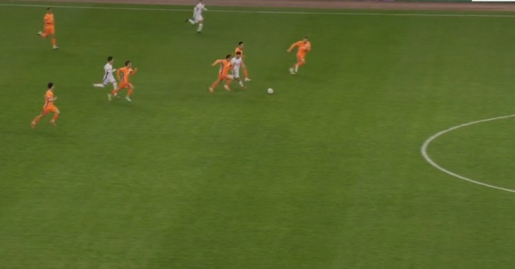 第77分钟,古尔芬克尔中场带球长驱直入杀入禁区,赵剑非关键倒地将球解围出底线。↓