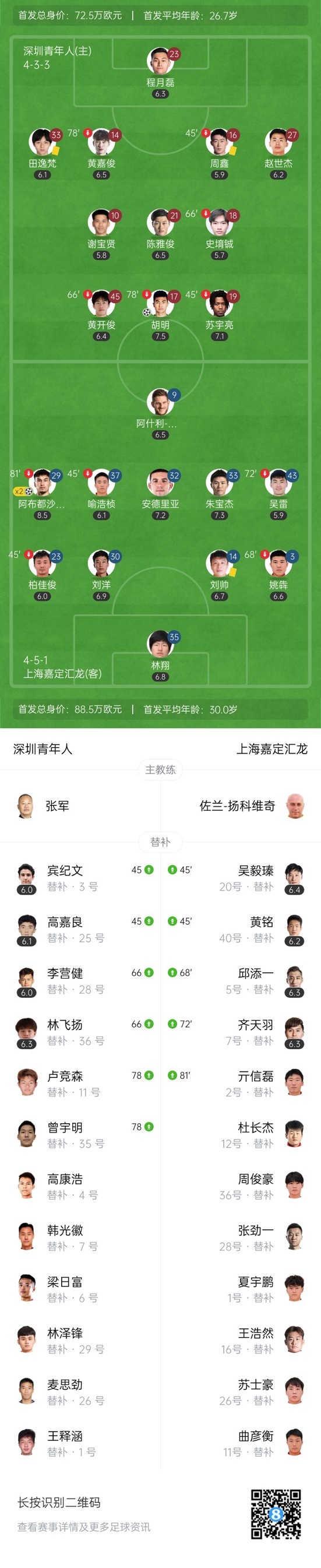 下半场补时8分钟,深圳青年人1-2上海嘉定汇龙。