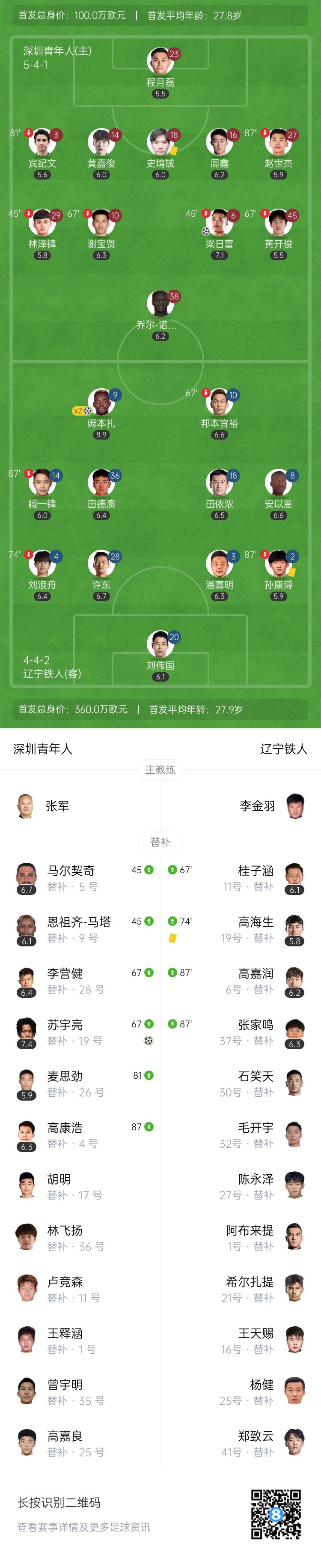 绝杀!辽宁铁人3-2深圳 姆本扎98分钟绝杀+双响 铁人4分优势领跑