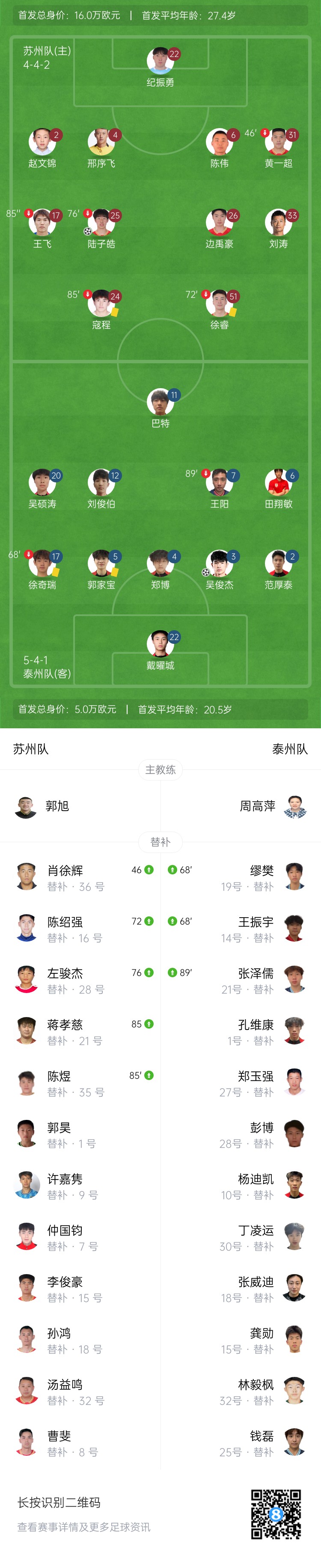 江苏联-苏州队1-1泰州队各取一分 陆子皓破门吴俊杰扳平