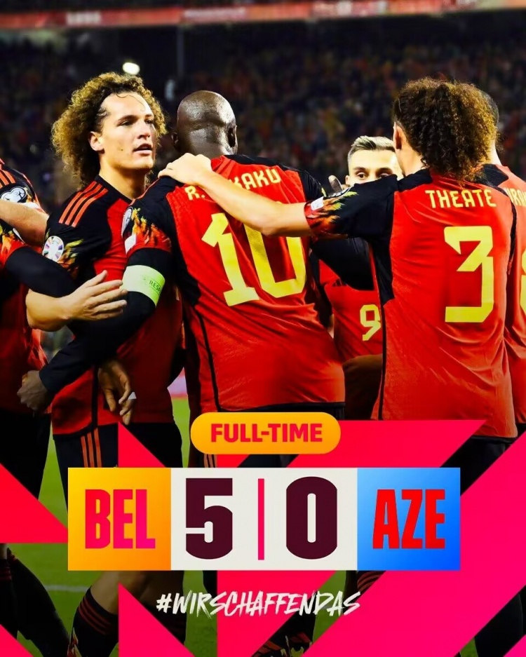 欧预赛-卢卡库4射4进球半场下班 比利时5-0十人阿塞拜疆头名出线