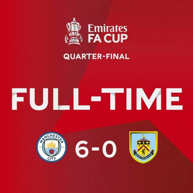 3月19日讯 北京时间3月19日凌晨1时45分,足总杯四分之一决赛,曼城主场迎战伯恩利。上半场,哈兰德梅开二度。曼城半场2-0领先伯恩利。下半场,哈兰德再下一城,随后阿尔瓦雷斯梅开二度,帕尔默也打进一球。最终曼城主场6-0大胜伯恩利,晋级足总杯四强。