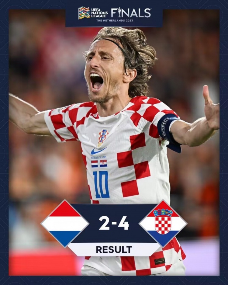 全场比赛结束,最终克罗地亚4-2荷兰。