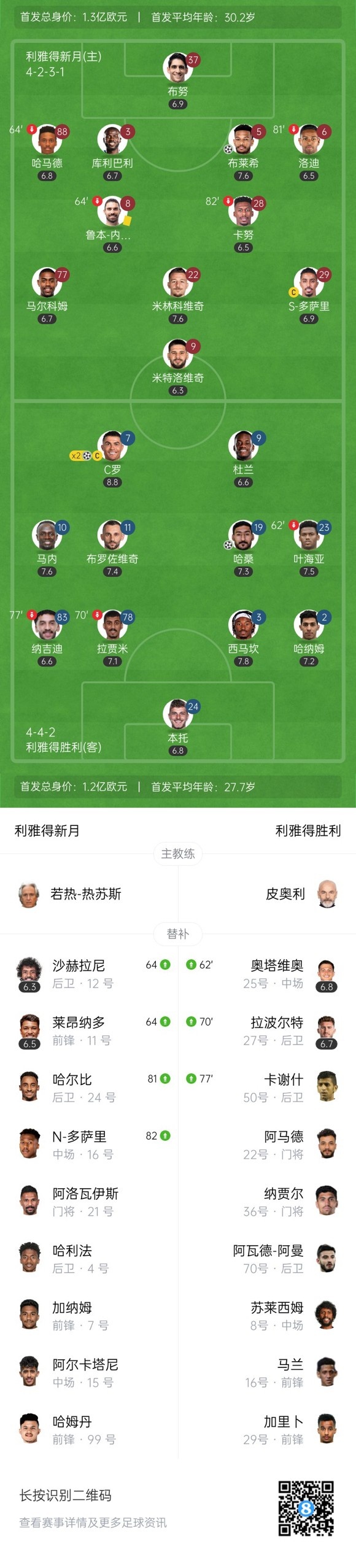 下半场补时12分钟,利雅得新月1-3利雅得胜利。