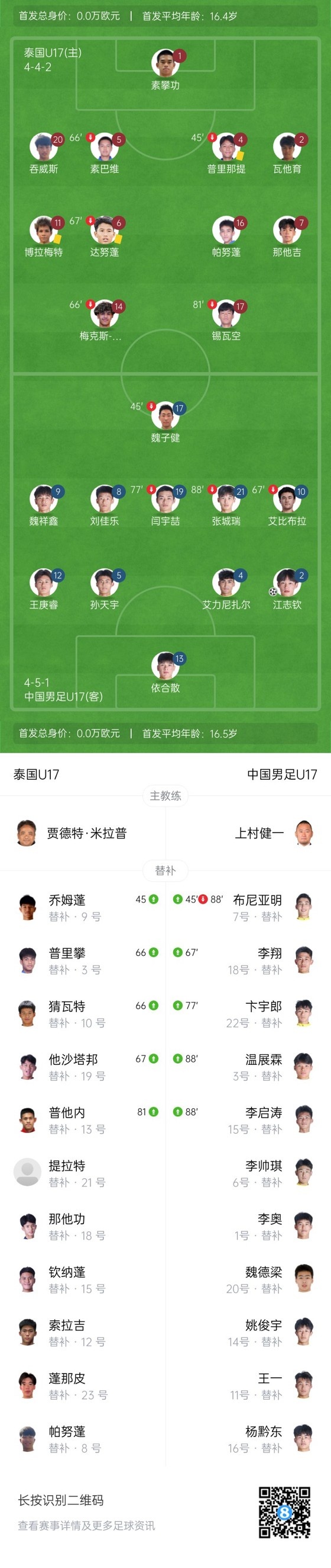 下半场补时4分钟,国少2-0泰国。