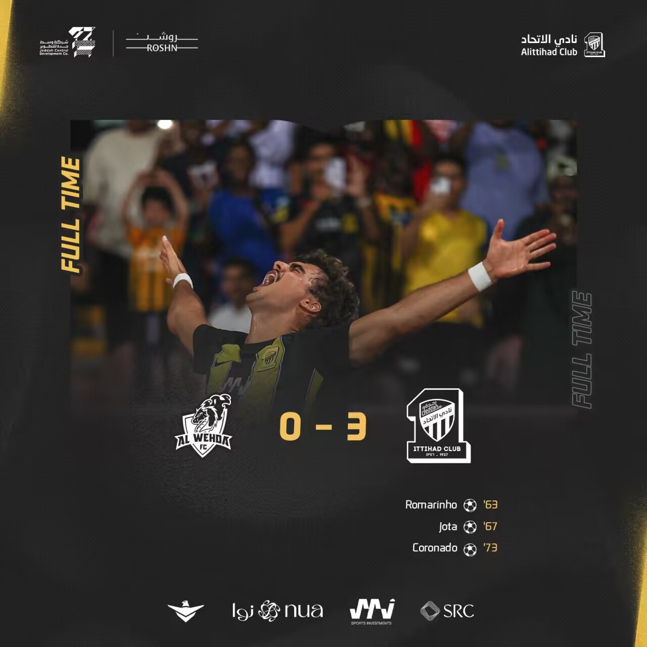 第74分钟,罗马里尼奥传到左路,科罗纳多拿球突入禁区右脚低射破门!吉达联合3-0麦加统一↓