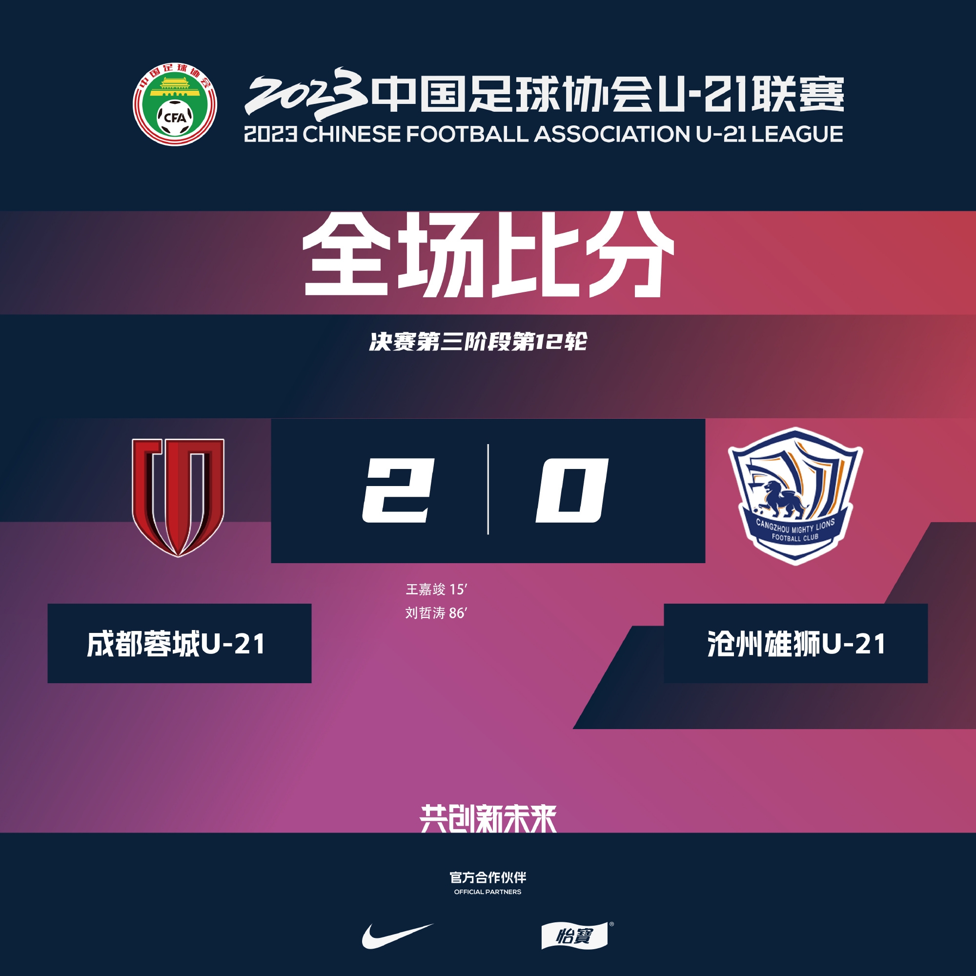 9月19日讯 2023中国足球协会U-21联赛决赛第三阶段第12轮,成都蓉城2-0击败沧州雄狮。