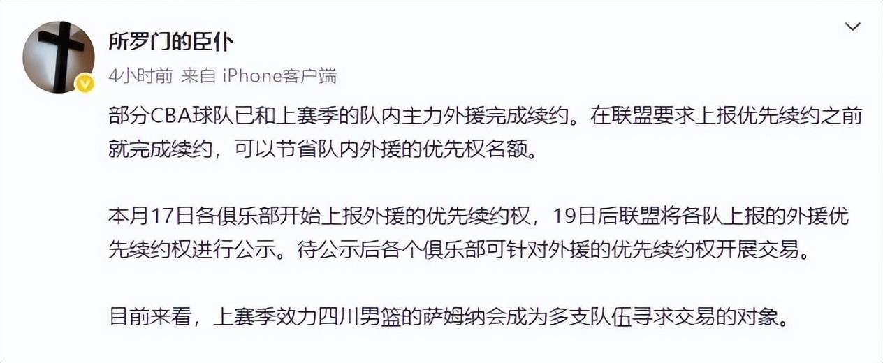 CBA官方已经下发了25-26赛季的相关规定,外援方面依旧是四节七人次的政策。在这个外援政策下,外援依旧会是决定球队成绩上限的关键。目前NBA夏季联赛已经开打,不少球队都派出了团队前往美国观战,并对外援进行考察。据媒体人“所罗门的臣仆”透露,上个赛季效力于四川男篮的小外援萨姆纳,已经成为了多支球队寻求交易的目标。