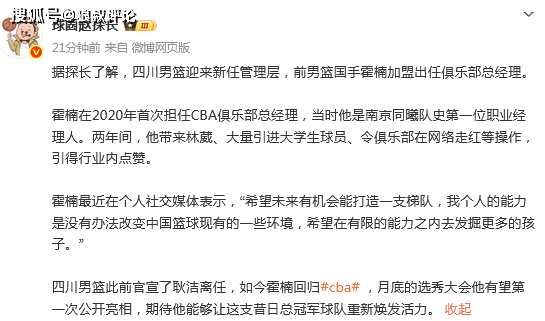 北京时间7月8日,根据媒体人赵探长爆料,四川男篮迎来新任管理层,前男篮国手霍楠加盟出任俱乐部总经理。