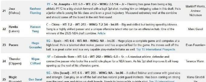 值得一提的是,该美媒在今年选秀就预测杨瀚森于首轮22顺位被选中,最终后者在首轮16顺位被开拓者拿下,成为所有美国选秀媒体中最接近正确结果的一家。