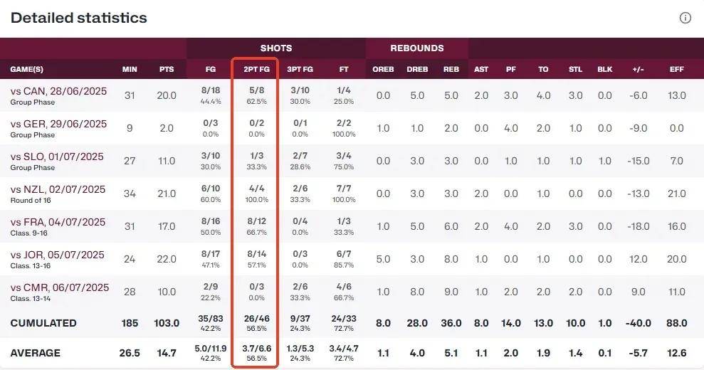 特别VS加拿大、斯洛文尼亚、德国、法国和新西兰5支强队,张博源面对身体素质丝毫不输自己的防守者,个人数据为29中18,命中率高达62%,主要展现出了自己较为强悍以及自信的单打硬解能力。