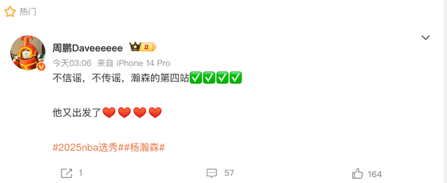 杨瀚森单独试训过的球队里包括亚特兰大老鹰,这支球队也是拥有多个首轮签,其中有22号签,同时老鹰过去1年多次派遣球探到中国观看杨瀚森的现场CBA比赛,可以说非常重视,这也被看作是老鹰有可能用首轮签选中杨瀚森的信号。