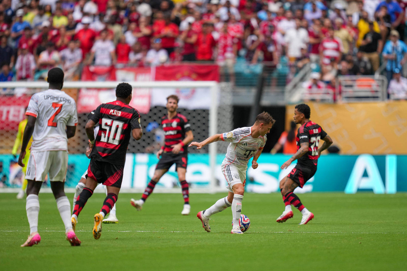 比赛开始后,实力更胜一筹的拜仁还是率先占据了场上主动,第6分钟,拜仁利用角球机会制造威胁,弗拉门戈中场普尔加在解围时不慎自摆乌龙,凭借对手送上的大礼,拜仁幸运地取得了1-0的领先。3分钟后,拜仁卷土重来,于帕梅卡诺前场完成抢断,凯恩得球后稍作调整果断起脚,皮球贴着立柱飞入球门死角,2-0!拜仁顺利扩大比分!