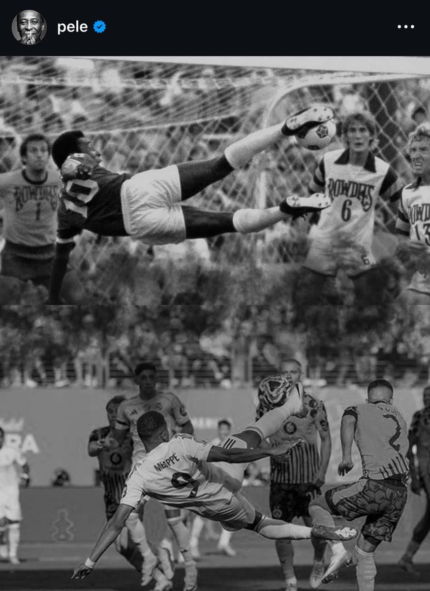 世俱杯四分之一决赛,姆巴佩在对阵多特蒙德时,打入一记精彩侧勾。赛后,贝利社媒对其进行了致敬。
