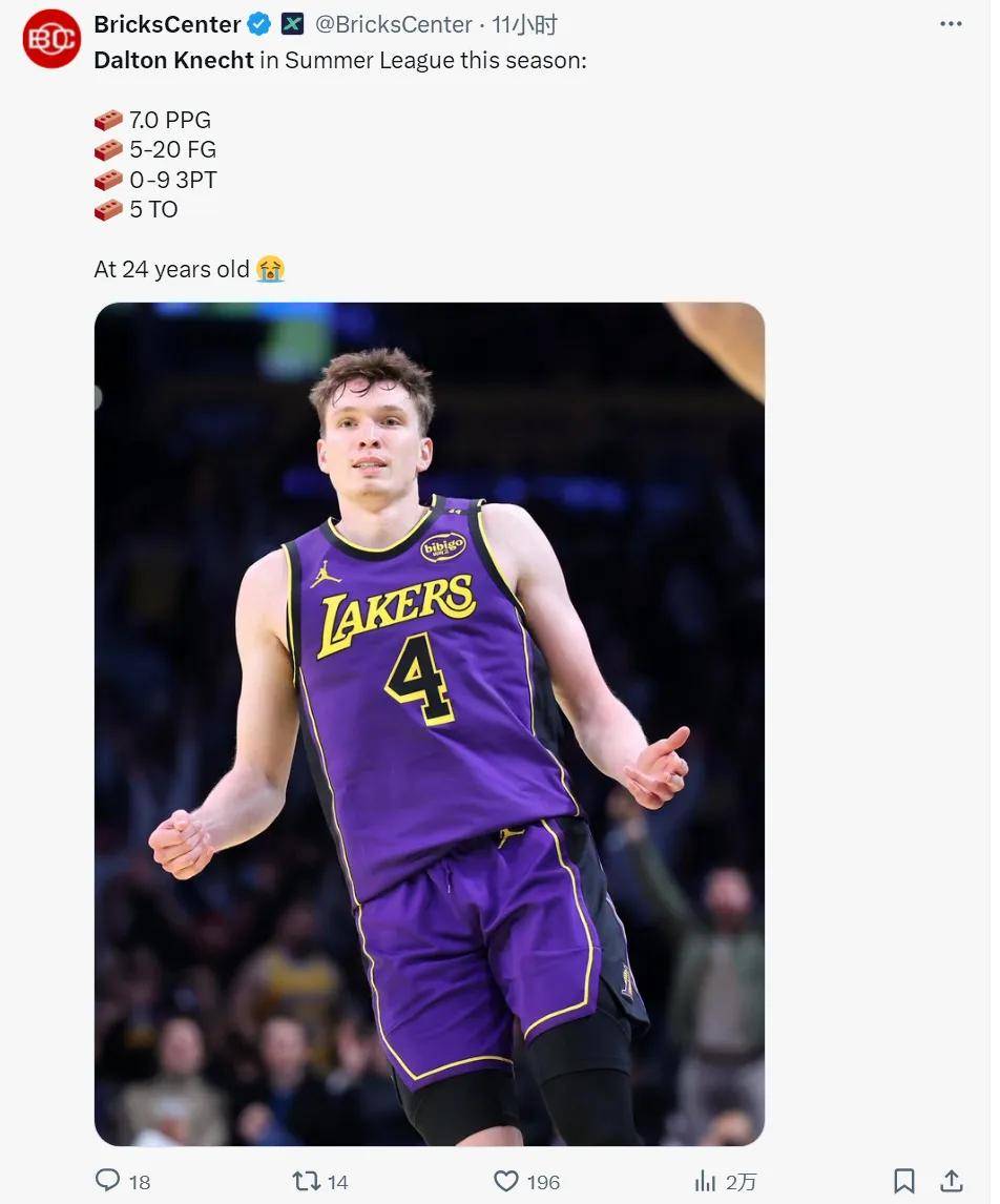 湖城夏季联赛和加州经典赛激战正酣,湖人已经打了两场比赛:首战84-89不敌勇士;次战103-83大胜热火。湖人今年的36号秀阿杜-蒂耶罗因伤缺席,去年17号秀克内克特成为夏联核心。但克内克特的表现,让湖人球迷极其失望。