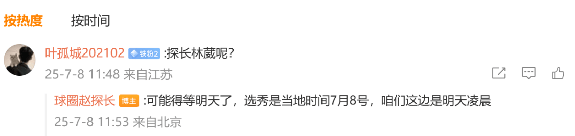 此前据媒体人球圈赵探长报道,林葳在等待G联盟的选秀结果,大概率不回CBA,他的选择包括打澳洲NBL、NCAA和G联赛。至于这个G联盟选秀,也闹出了一个乌龙,此前赵探长曾透露是7月8日会有选秀,结果没曾想是美国时间7月8日,而林葳的中方经纪公司也没对此进行任何解释,反倒是有部分同曦球迷替林葳打抱不平,去社媒质问,结果却被他们拉黑。