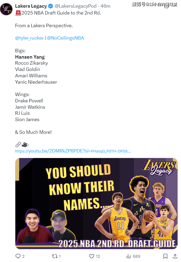 北京时间6月21日晚些时,湖人媒体Laker Legacy还在期待55号签捡漏杨瀚森呢,因为杨瀚森的经纪公司正好是Klutch Sports,里奇保罗与湖人管理层交情匪浅。