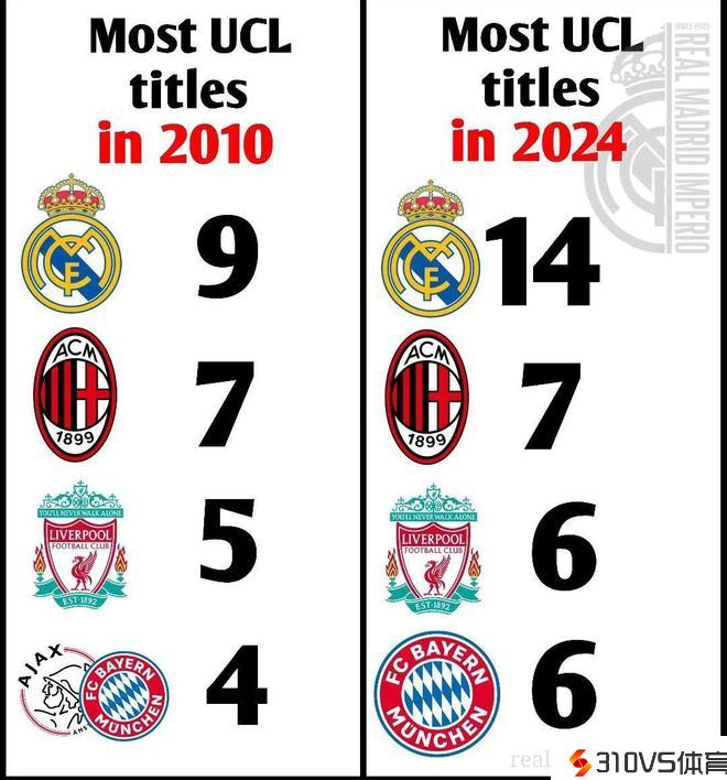 欧冠2010年-2024年:皇马9冠→14冠,米兰仍7冠,利物浦、拜仁6冠