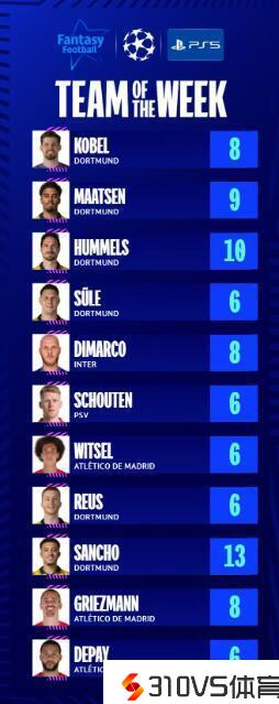欧冠官方周最佳阵:格列兹曼、迪马尔科在列,多特6人中选