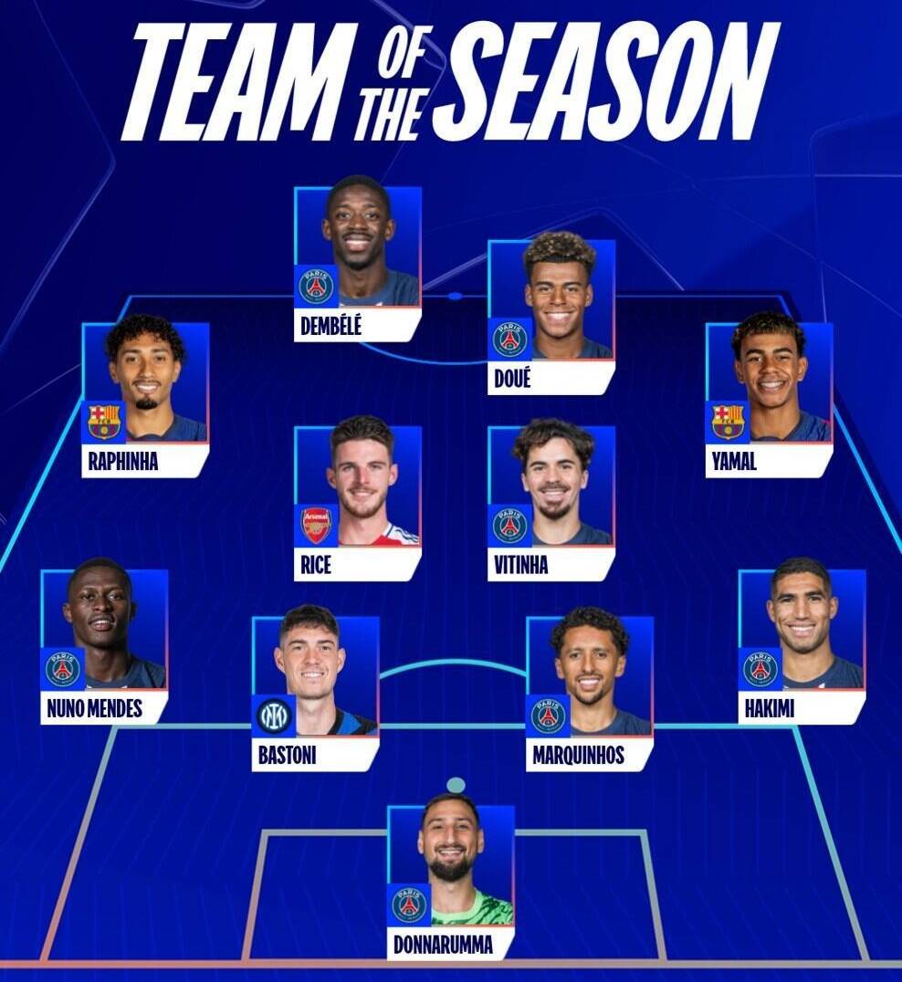 巴黎圣日耳曼的统治力在最佳阵容中体现得淋漓尽致。意大利国门多纳鲁马凭借整个赛季尤其是淘汰赛阶段的高接低挡,毫无悬念地占据最佳门将位置。