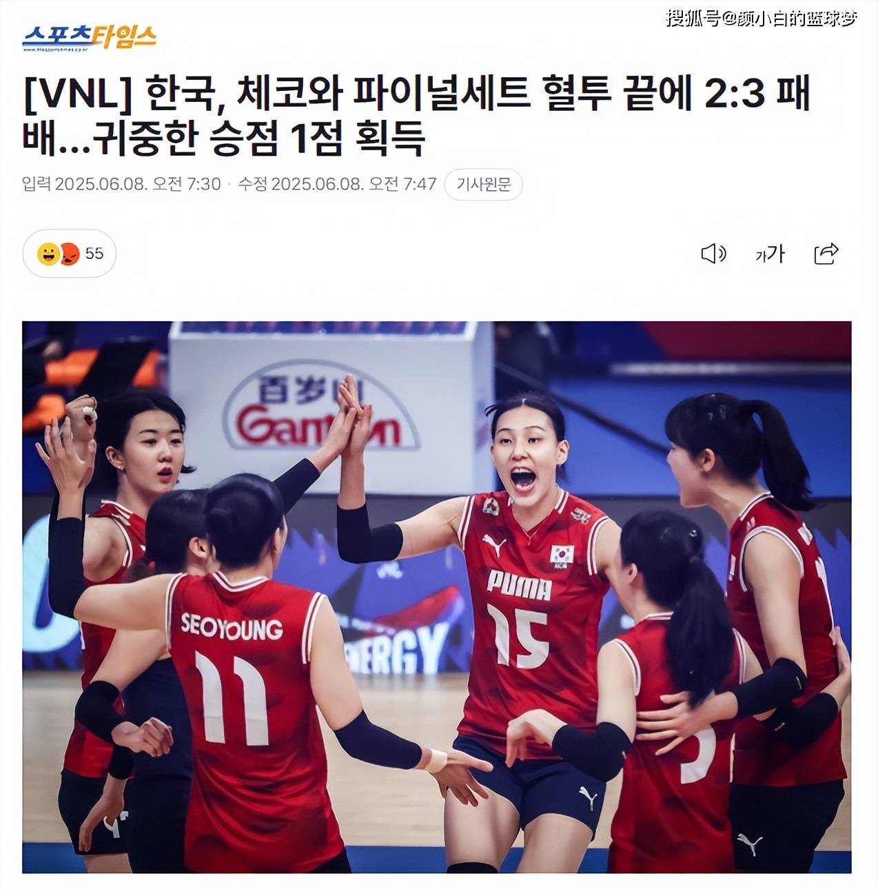 韩媒赛后的发文《韩国女排2-3被捷克逆转。。。。但她们拿到了宝贵的1分》,没错,韩国队拿1分也很宝贵。