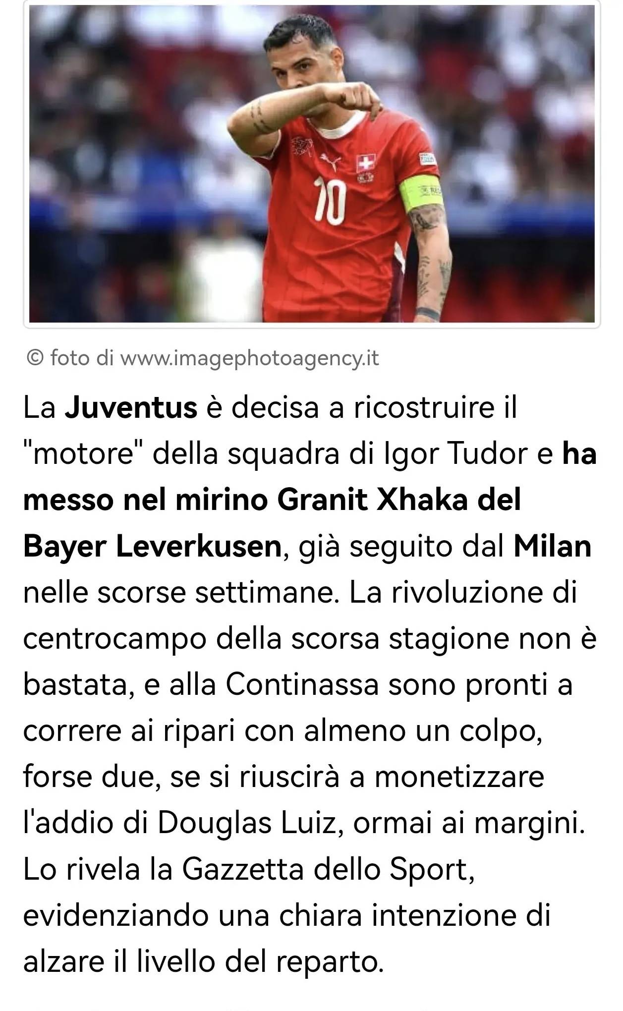 尤文图斯决心重建伊戈尔·图多尔麾下球队的“引擎”,将目标锁定在勒沃库森的格拉尼特·扎卡身上,米兰在过去几周也关注过这位球员。