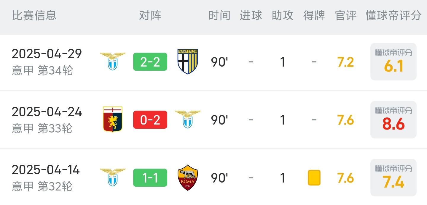卢卡-佩莱格里尼本赛季为拉齐奥各项赛事出战30场,作为后卫送出4次助攻。值得一提的是,其中的3次助攻是在意甲联赛32-34轮连续完成的。