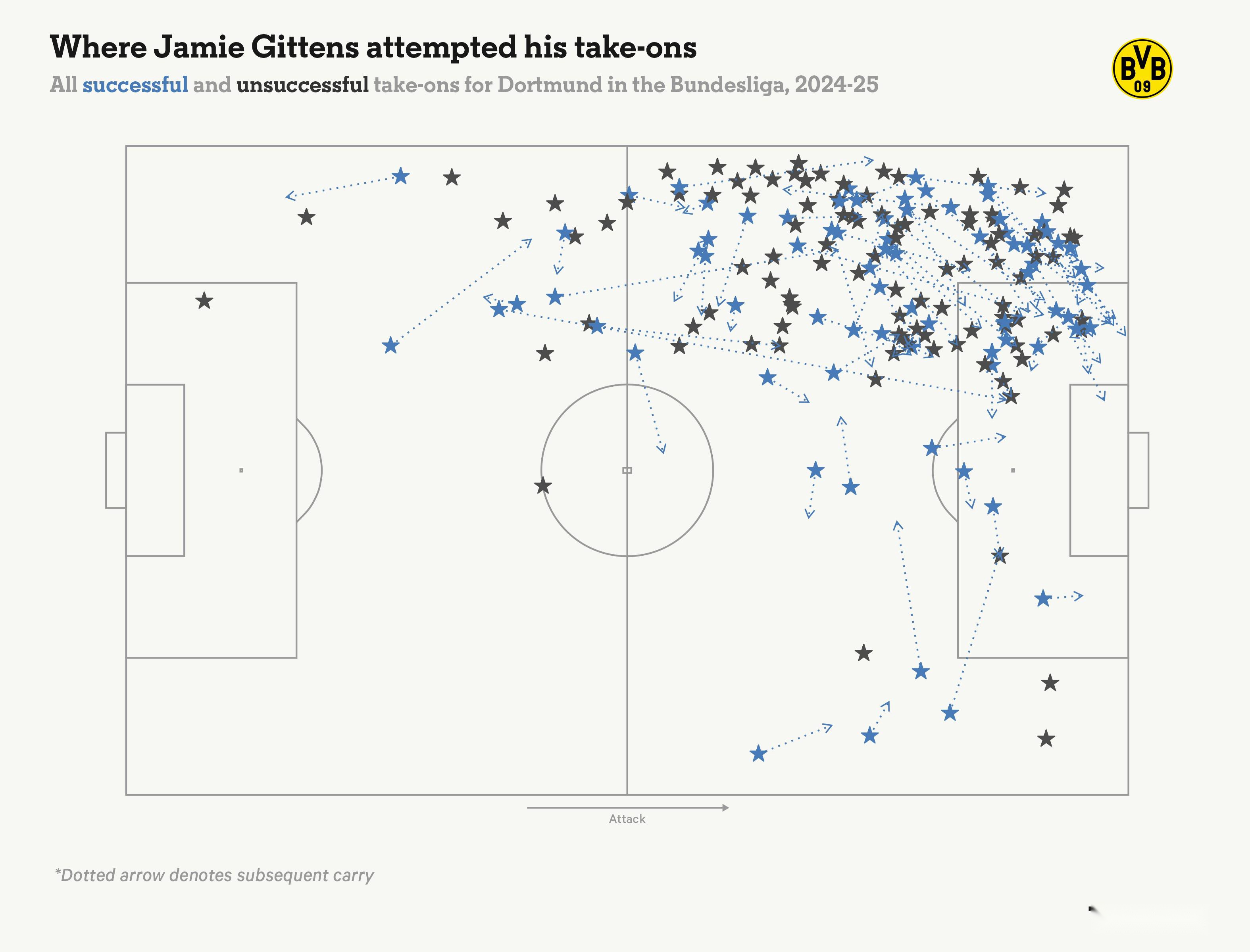 在此背景下,吉滕斯是一笔必要的补充。这位20岁的球员是一名进攻型边锋,喜欢一对一对决。他上赛季在德甲场均9.3次尝试过人,是所有边路球员中最高的。在如此高频率下仍能保持45%的成功率,证明了他的盘带能力。