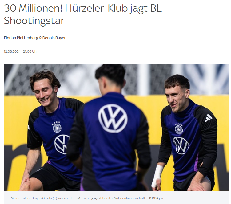 20岁的格鲁达与美因茨的合同到2026年,双方同意转会费在3000万欧左右,不过双方目前还未签字也未安排体检。