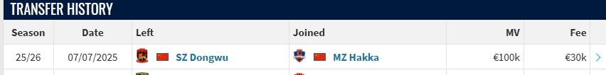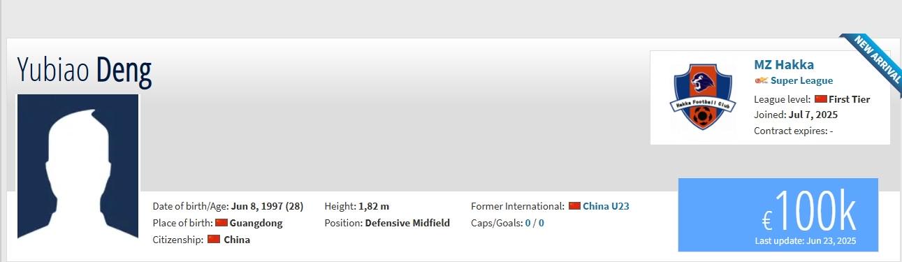 另外,德国转会市场网站上的信息显示,邓宇彪加盟梅州客家的转会费为3万欧元(折合人民币约25.3万元)。