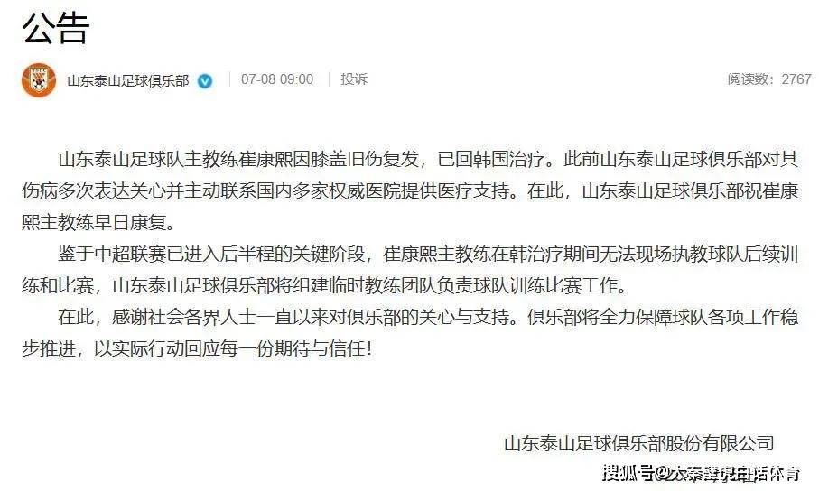 就在很多球迷海外坐等闹剧是何结局收场时,北京时间上午9点,泰山官宣了一纸通告,等于是变相宣布崔康熙下课的消息。
