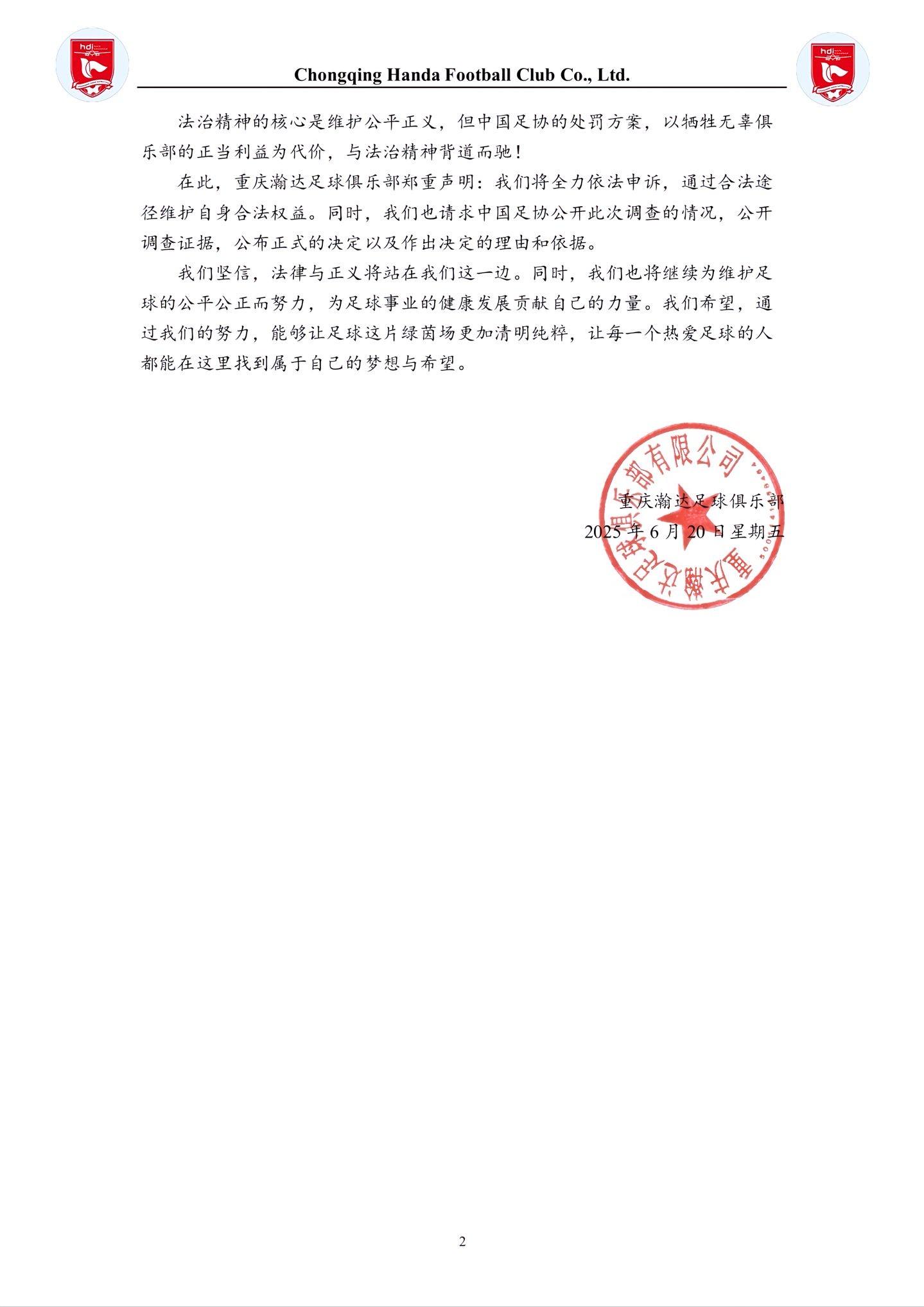 重庆瀚达声明:对于中国足协的处罚结论深感震惊,无法接受