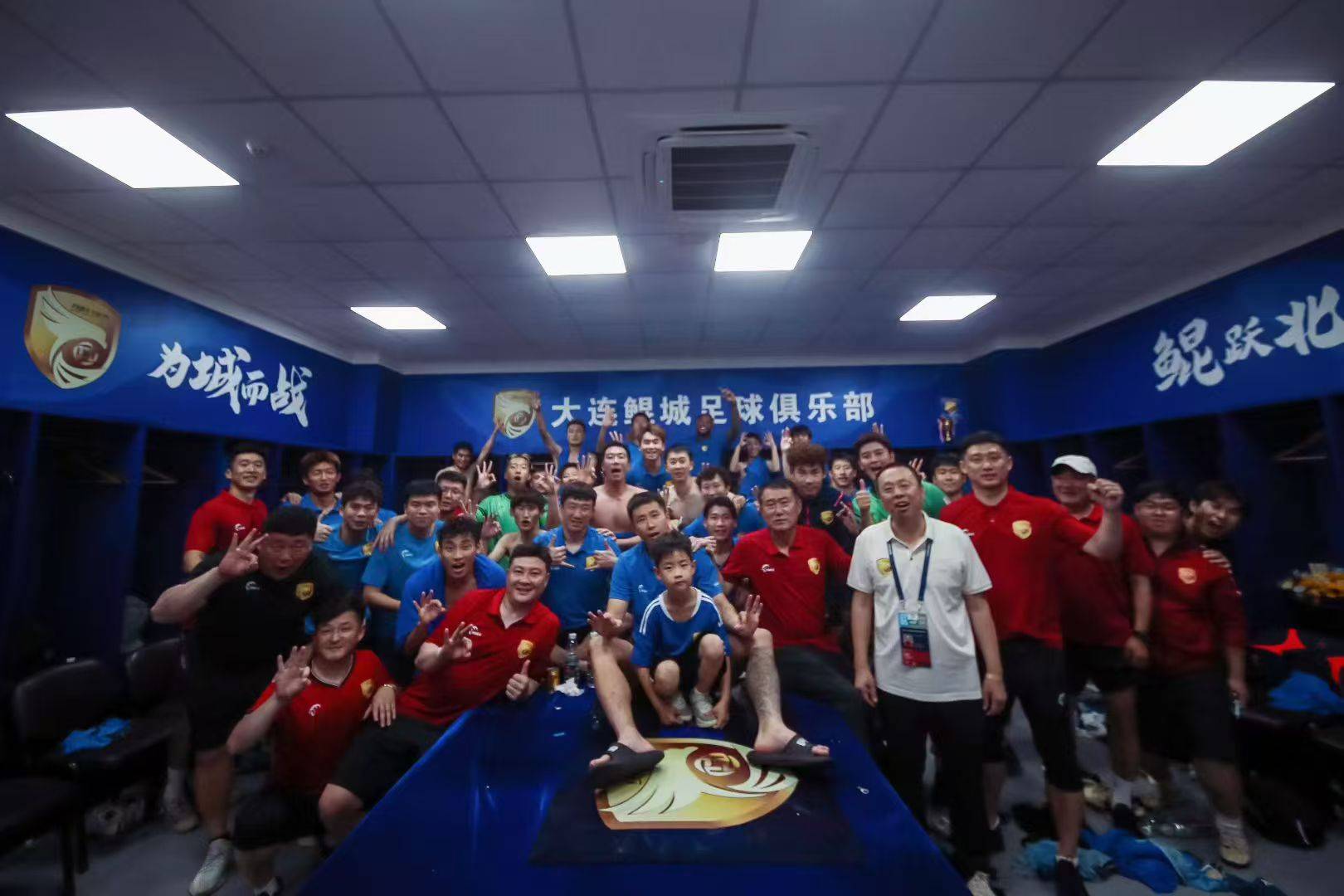 赛后,大连英博足球俱乐部投资人李俊斗和全体将士在更衣室合影庆祝。拿下三分后,大连鲲城在少赛一轮的情况下,积19分升至中甲积分榜第十,已经甩开降级区10分,后面的比赛中可以轻装上阵。
